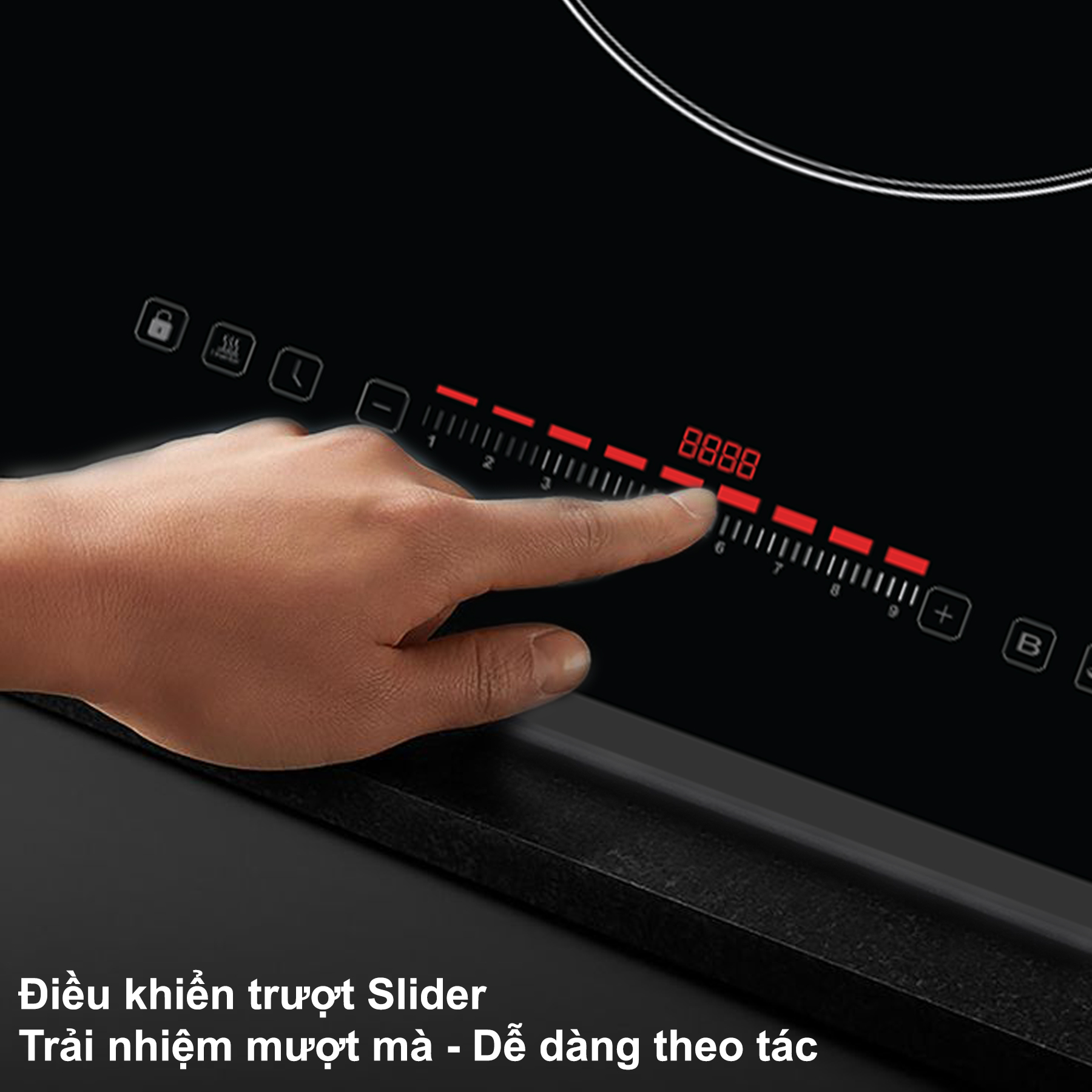Để chọn khu vực nấu bên phải hoặc bên trái, bạn nhấn bộ điều khiển dạng trượt (ở khu vực nấu bạn muốn) chọn các mức từ 0-9.