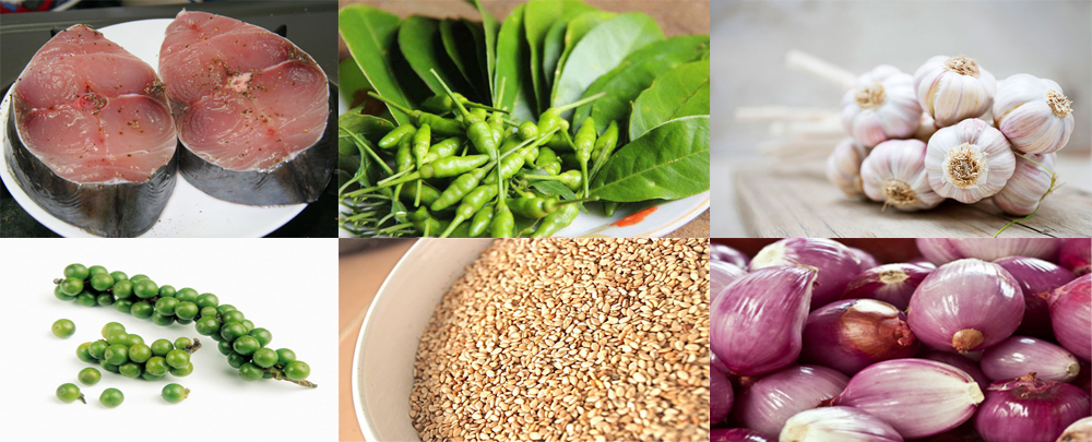 - Hành khô, tỏi, gừng, lá chanh, ớt
