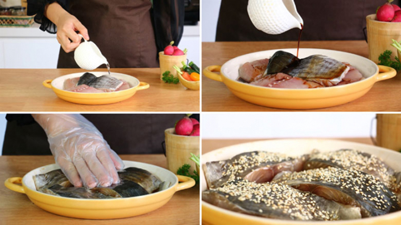 - Ướp khoảng 1 tiếng cho sốt thâm đều vào phần thịt cá. Ướp càng lâu thì cá càng có vị đậm đà.