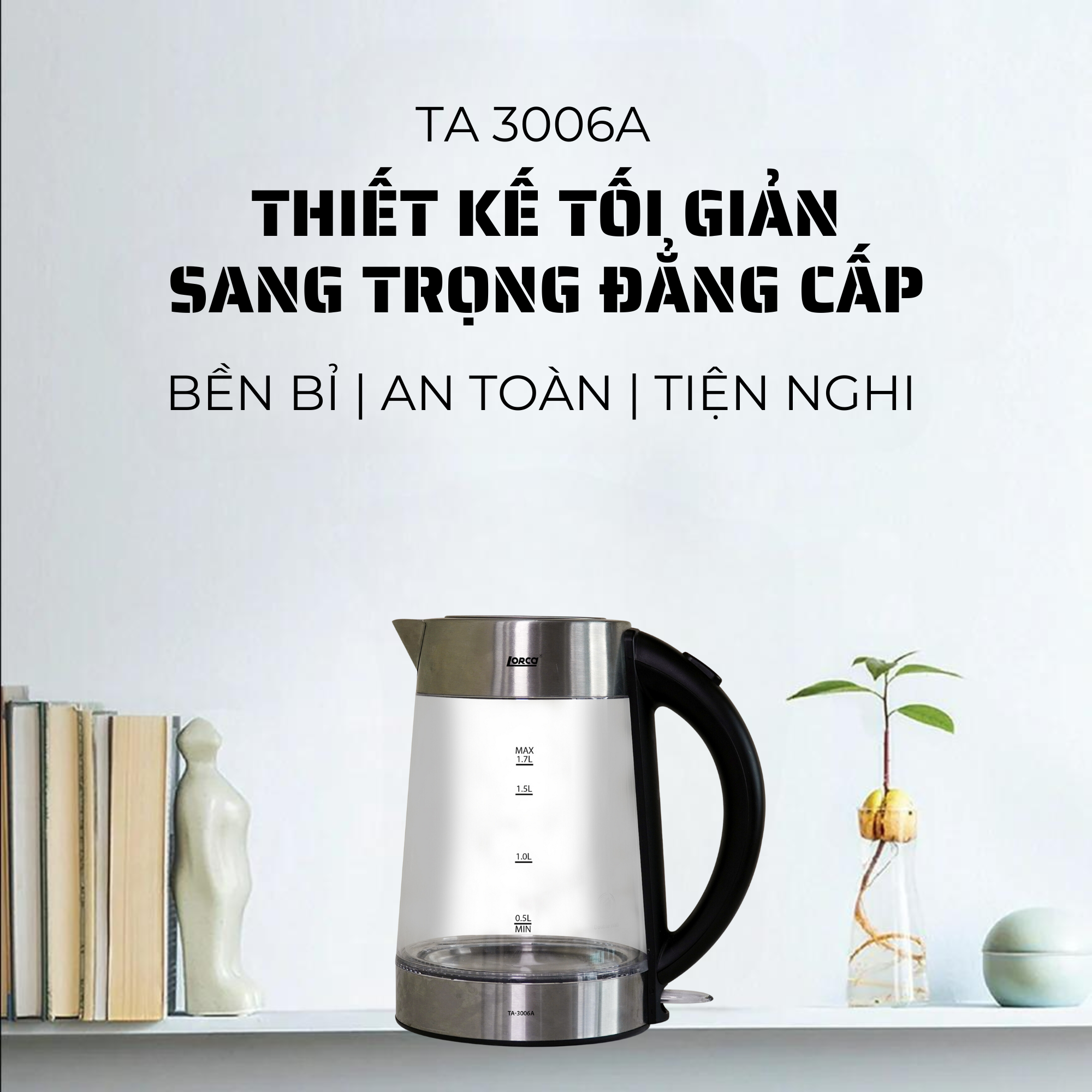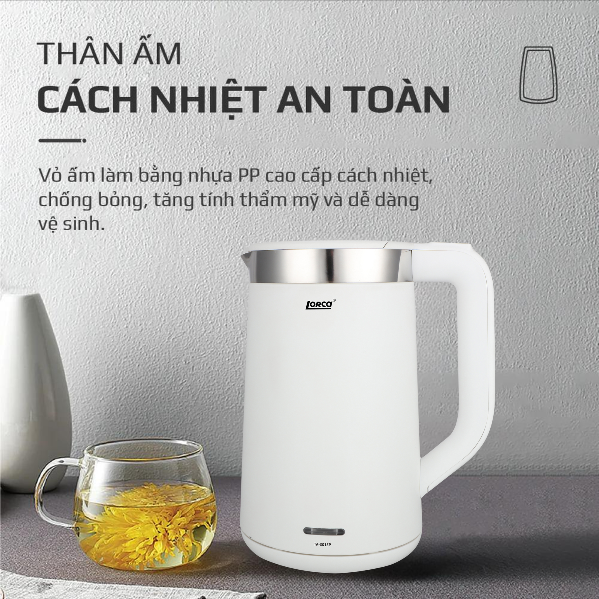Mẫu ấm đun siêu tốc LORCA TA 3006A thiết kế độc đáo lớp vỏ nhựa bên ngoài trong suốt. Sản phẩm có dung tích 1700ml, công suất đun 2200W với các đặc điểm nổi bật như: