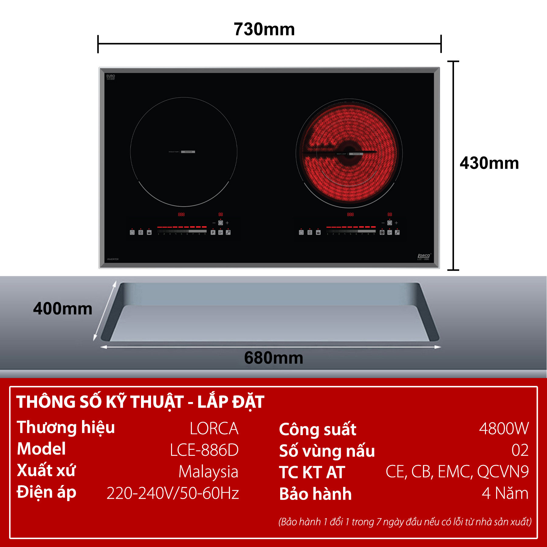 - Cam kết cung cấp bếp từ LORCA LCE 886D chính hãng có đầy đủ tem phiếu truy xuất nguồn gốc xuất xứ.