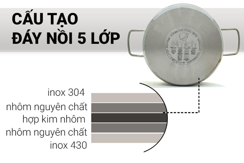 Nồi inox 5 đáy có phần đáy nồi được cấu tạo từ 5 lớp: