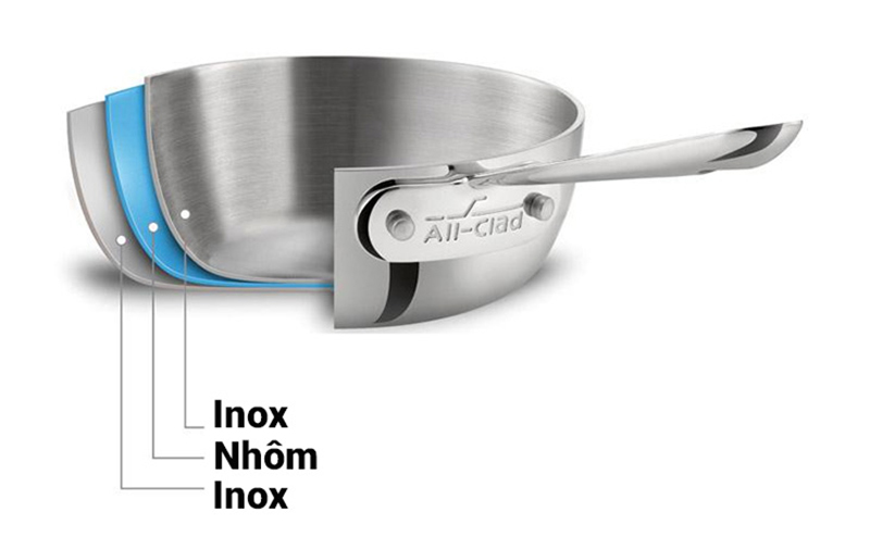 Nồi inox 3 đáy là loại nồi khắc phục được những nhược điểm của nồi inox 1 đáy. Nồi có cấu tạo đáy 3 lớp: 1 lớp inox bên trên, ở giữa là lớp nhôm giúp tản nhiệt đều ra toàn bộ phần đáy lớp bên ngoài là inox.