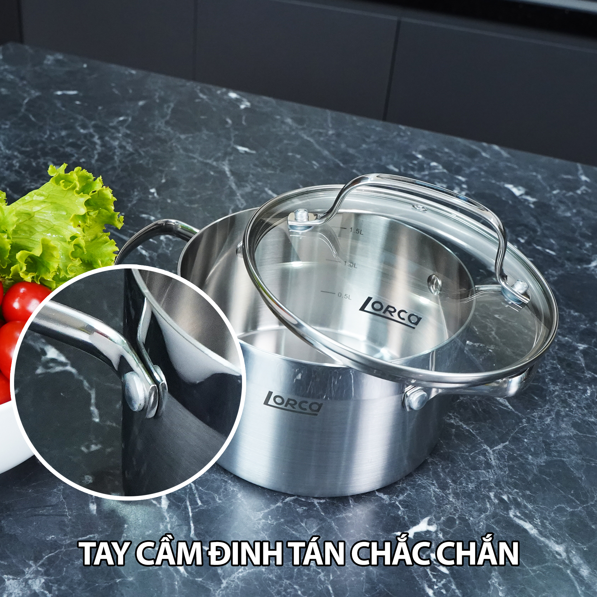 Bộ nồi inox LORCA TA 5509 dung tích 1.5 lít phù hợp với những gia đình có từ 2 – 4 thành viên. Sản phẩm tạo ấn tượng mạnh mẽ với phần tay cầm nồi thiết kế đinh tán chắc chắn chịu trọng lực rất tốt. Đáy nồi sản xuất bằng công nghệ hiện đại với cấu tạo 3 lớp truyền nhiệt đều, giữ nhiệt lâu tạo hiệu ứng ủ nhiệt 3D độc đáo. Tính năng này giúp thức ăn được nấu chín mềm, thơm ngon, không bị thất thoát chất dinh dưỡng như các mẫu nồi inox khác.